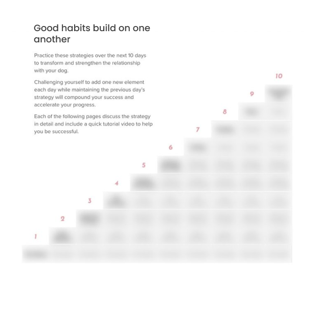 Each day you’ll learn a new strategy that builds on the previous day's concept. As you layer these strategies one on top of the next you'll notice your bond with your dog becoming closer. At the end of 10 days, you'll have a dog that is more tuned into you, more respectful, and more fulfilled. The best part is these are tools you can sustain and return to any time you need a reboot.